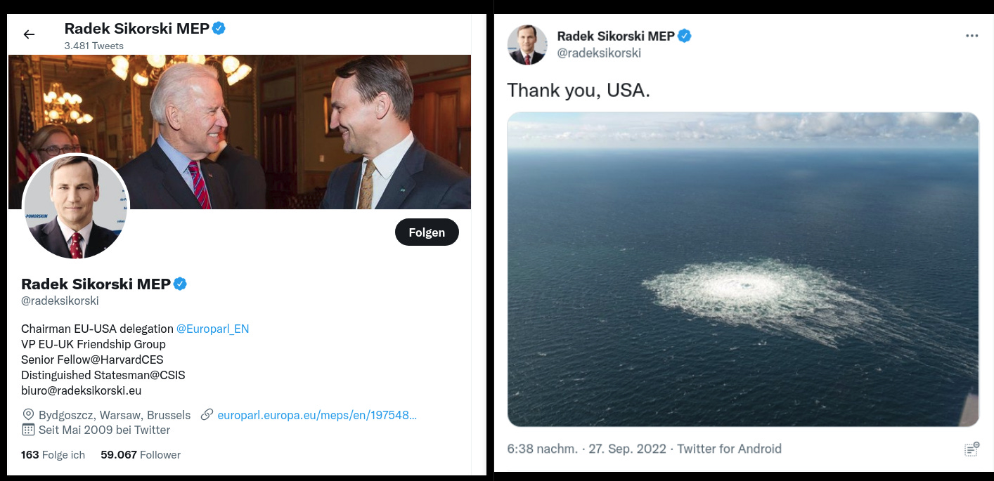 Sikorski twitterte ein Bild des Gaslecks und schrieb dazu: