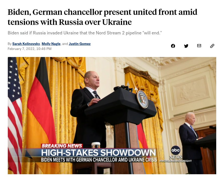 Brauchen wir noch mehr Beweise? Interessanterweise haben sogar die FakeNewsMedien diese Aussage von Biden gebracht. ABC-News brachte es am 7. Februar 2022 und Biden sagte es im Beisein von Bundeskanzler Olaf Scholz: